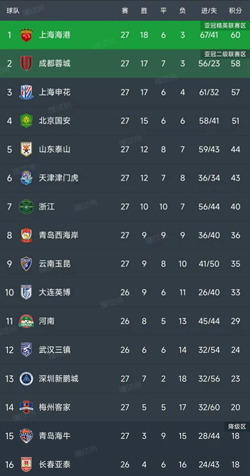 北京时间10月19日,中超联赛第27轮6场比赛结束。一起来看看最新的排名变化吧!最新一期中超联赛争夺胜利的球队是上海海港、成都蓉城和上海申花。昨晚,国安队1-2不敌深圳队,与冠军相差无几。本场比赛,海港凭借莱昂纳多的梅开二度以及李新祥、加布里埃尔的重要进球,以4-3击败青岛海牛,实现四连胜。哈伯最近几场比赛的防守很差,连续四场比赛至少失两球。好在攻击力在线,尤其是莱昂纳多,四场比赛打进八球,是球队冲冠的得分利器。海港暂时占据首位。目前海钢在积分榜上领先,领先成都2分,领先申花3分。本轮,荣成德在杨明阳、莱切特和洛穆洛的帮助下,以3-1击败梅州客家。上海申花队凭借老将吴曦和于汉超的梅开二度,以2-1战胜了九队青岛西海岸队。联赛只剩三天了。我们将继续关注海港、成都和申花谁将取得领先,最终谁能获胜!国安联赛夺冠无望。北京国安虽然上半场获胜,但下半场继续落后,浪费了又一次良机。昨晚他们客场对阵降级球队深圳新鹏城。国安防守不佳,上半场连续丢两球。韦斯利和加西亚互射,张佑宁下半场只打进一个挽回颜面的进球,导致1-2落败。目前国安积51分排名第四。进入前三存在障碍,他们不会很快跌落到第五位。最重要的比赛对于他们本赛季可能会进入足总杯决赛。与卡纳姆的对决将决定本赛季的收获。深圳的三个关键点 深圳队的决赛赛程最为艰难,要对阵四强中的三支球队,但凭借这场胜利,他们已经超越国安队,目前积23分,落后降级区5分。他们手中掌握着降级的命运。梅州客家虽然输给了塞城,但积20分排名倒数第三。青岛海牛队输给海港队,目前积18分排名倒数第二。本赛季最后一名的对手是卡南队,他们需要三分才能保命!山东浙江队则以2-2的比分与山东泰山浙江队握手言和。卡扎罚丢点球,黄征宇和克雷桑(点球)破门。亚戈·卡莱罗和奥乌苏为浙江队的进球做出了贡献。山东泰山积44分暂居第五,浙江积40分排名第七。蒂亚号南京金门虎队0-2不敌云南育昆队。奥斯卡点球得分,恩里克也贡献了力量。天津队积43分暂居第六位,云南玉昆队积35分排名第九位。